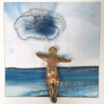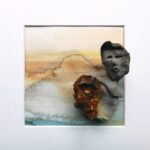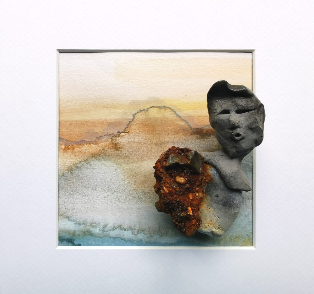 schwarzer Ton glasiert mit Stein (Ostsee) auf Aquarell, gerahmt (25 x 25 cm,) 9,5 x 6 x 4,5 cm